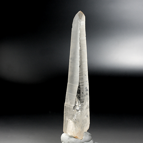 ほぼ無色と言えますが、うっすらと表面がピンクっぽく色づいています。柱面が先細りで錘面と呼べる部分が極端に小さく、レムリア水晶の特徴が良く出ています。
