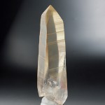 表面に鉄分が付着し表面がオレンジ色にコーティングされたレムリア水晶。うっすらとコーティングされた状態なので透明感があり引き締まった表情を見せます。シャープなエッジを持つと共に、条線がくっきりと浮かび上がり、柱面が先細りで錘面と呼べる部分が極端に小さく、レムリア水晶の特徴が良く出ています。太くどっしりとした姿で抜群の存在感を示します。
