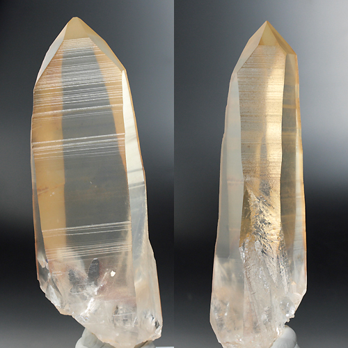 レムリア水晶は、形状としてはレーザー型に分類される水晶。レムリア水晶の特徴はほのかに薄いピンク色と柱面に条線(成長線)がある点です。条線は柱面に横に入っており、通常の水晶にも入っている場合がありますが、レムリア水晶の場合は条線がはっきりとしています。また、柱面の幅が幅広の面、幅細の面と交互になっているモノが多くみられ、全体的に先細りとなり先端部の錘面は小さくなる形状のモノを分類しています。